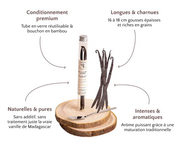Nos gousses de vanille sont conditionnées dans des tubes en verre (offres par 10 et 20 gousses) ou en sachets sous vide (offres par 250 g, 500 g, 1 kg), garantissant une conservation optimale de leur fraîcheur et de leurs arômes. Stockez-les dans un endroit frais et sec, à l’abri de la lumière. Bien conservées, vos gousses de vanille ne se périment pas. Toutefois, pour un maximum d'intensité aromatique, nous recommandons de les utiliser dans les 2 à 3 ans.